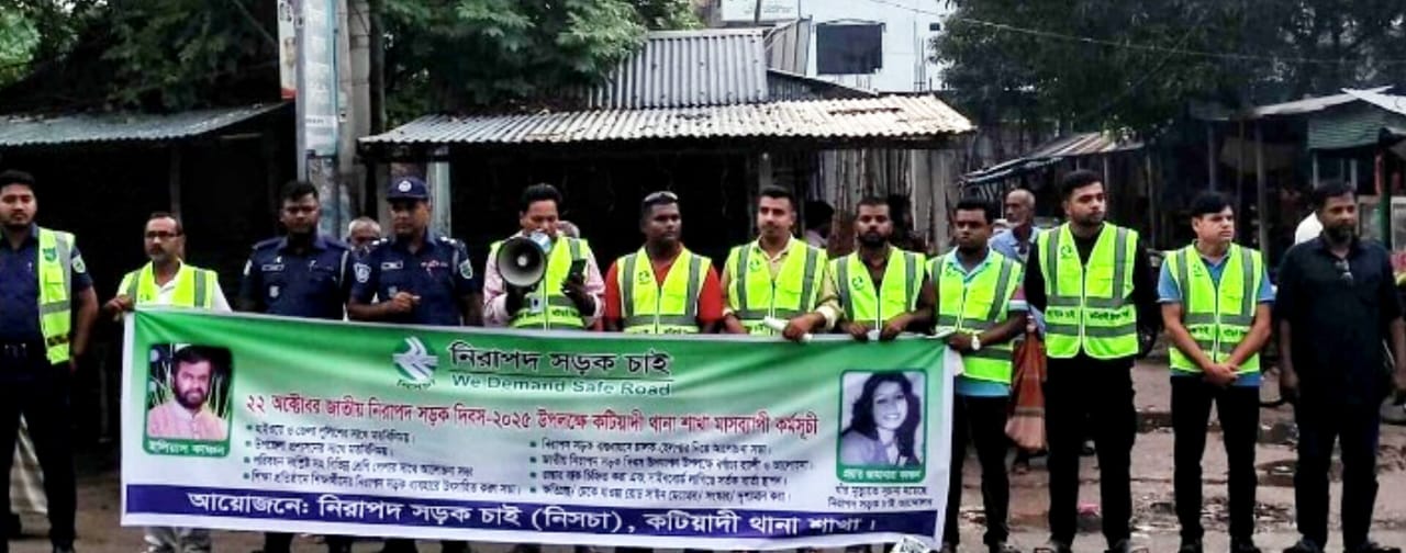২২ শে অক্টোবর ২০২৫ কিশোরগঞ্জের কটিয়াদীতে জাতীয় নিরাপদ সড়ক দিবস উপলক্ষে “নিরাপদ সড়ক চাই (নিসচা)” কটিয়াদী উপজেলা শাখার উদ্যোগে বানিয়া গ্রাম বাসস্ট্যান্ডে এক বর্ণাঢ্য র্যালি ও আলোচনা সভা অনুষ্ঠিত হয়।