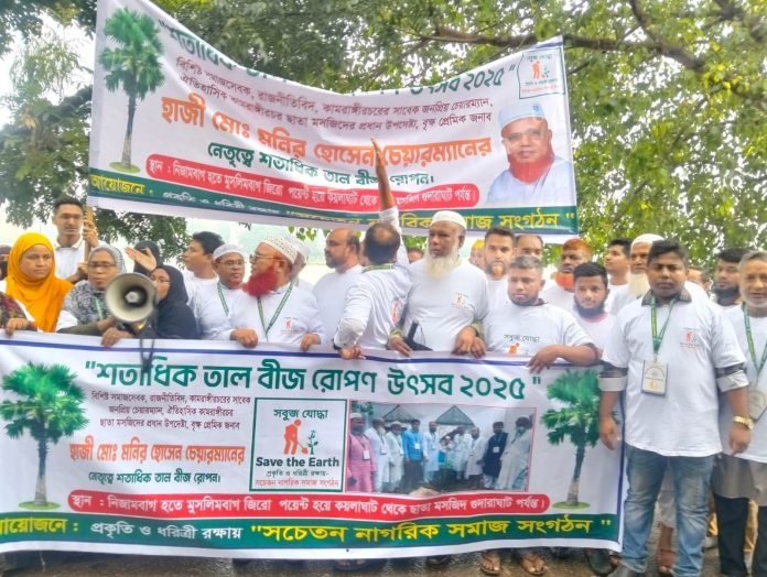 আজ ১১ অক্টোবর ২০২৫:পরিবেশ সংরক্ষণ ও সবুজায়নের লক্ষ্যে সচেতন নাগরিক সমাজ সংগঠনের উদ্যোগে রাজধানীর কামরাঙ্গীরচরে এক বর্ণাঢ্য রেলি ও শতাধিক তালবীজ রোপণ কর্মসূচি অনুষ্ঠিত হয়েছে।