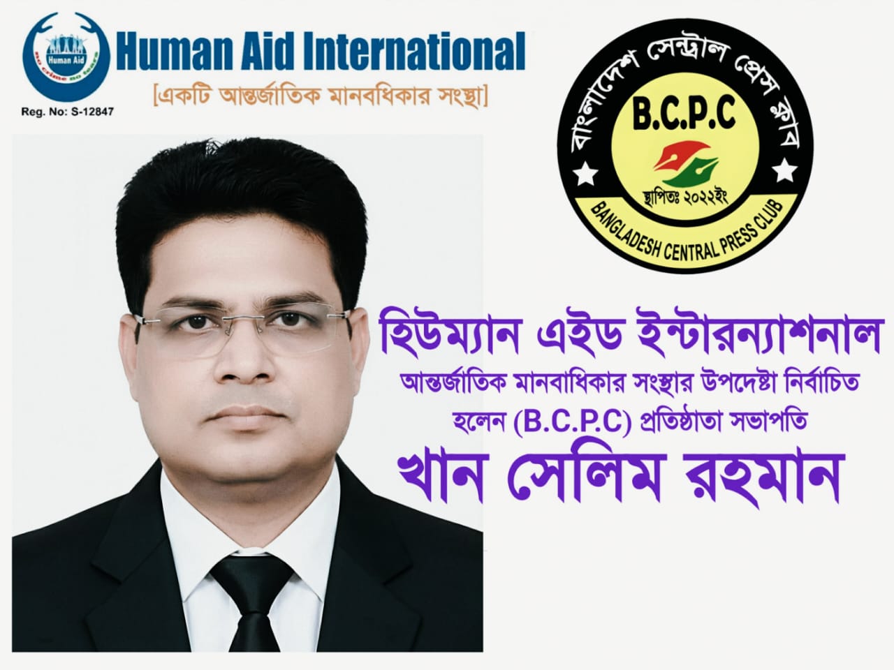 বাংলাদেশ সেন্ট্রাল প্রেস ক্লাব (BCPC)-এর প্রতিষ্ঠাতা সভাপতি, বিশিষ্ট সাংবাদিক ও মানবাধিকার কর্মী খান সেলিম রহমান আন্তর্জাতিক মানবাধিকার সংস্থা ‘হিউম্যান এইড ইন্টারন্যাশনাল’-এর উপদেষ্টা পরিষদের স্থায়ী সদস্য নির্বাচিত হয়েছেন। গত শনিবার (২৭ ডিসেম্বর) সংস্থার নীতিনির্ধারণী পরিষদের এক জরুরি সভায় সর্বসম্মতিক্রমে এই সিদ্ধান্ত নেওয়া হয়।